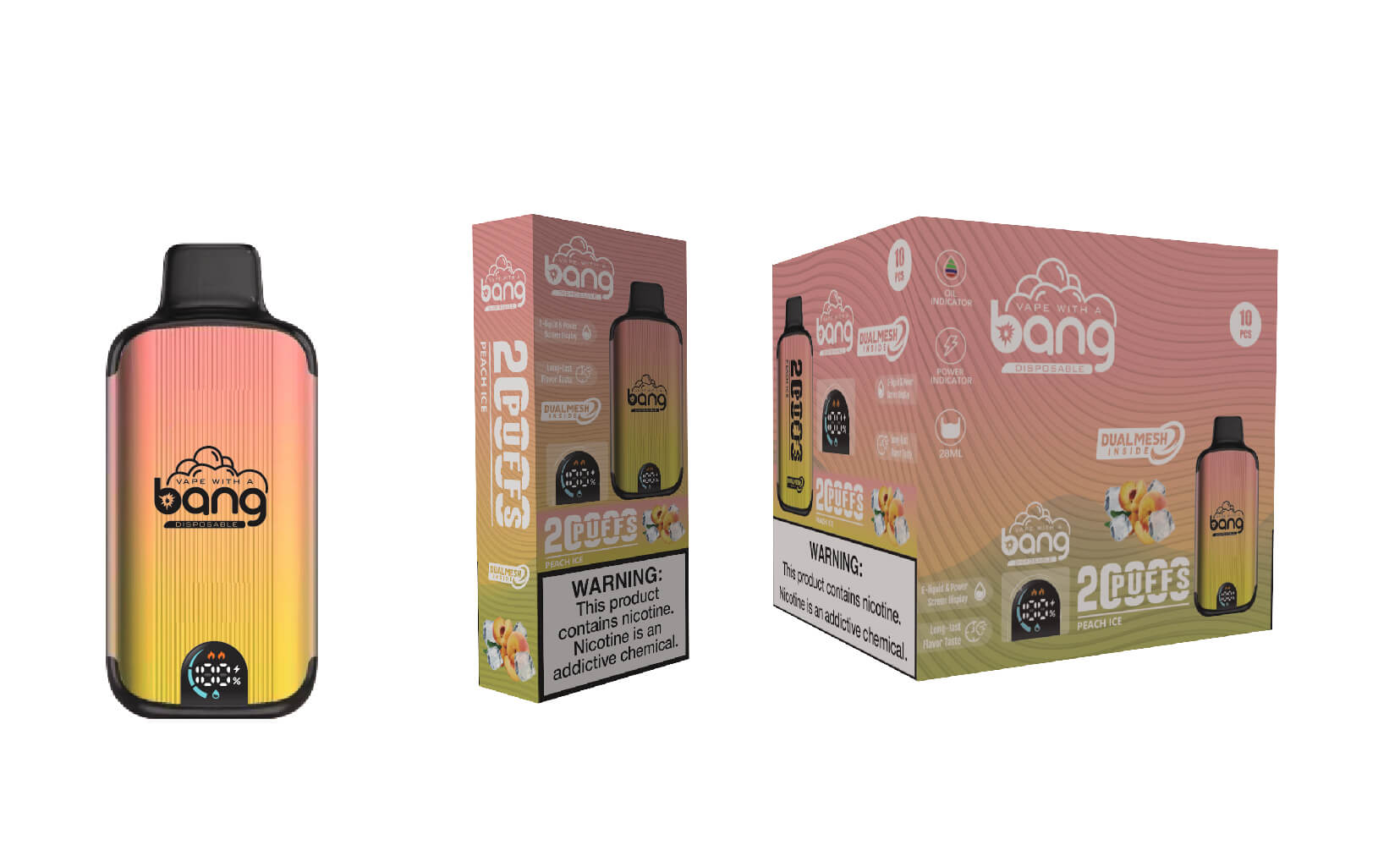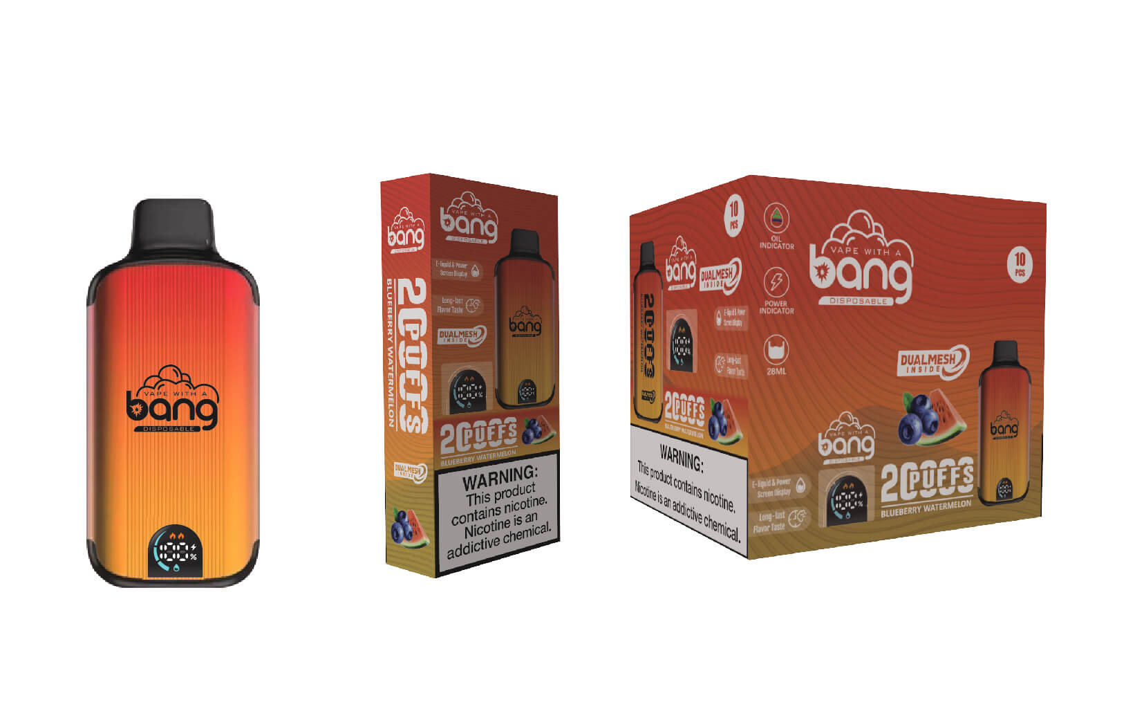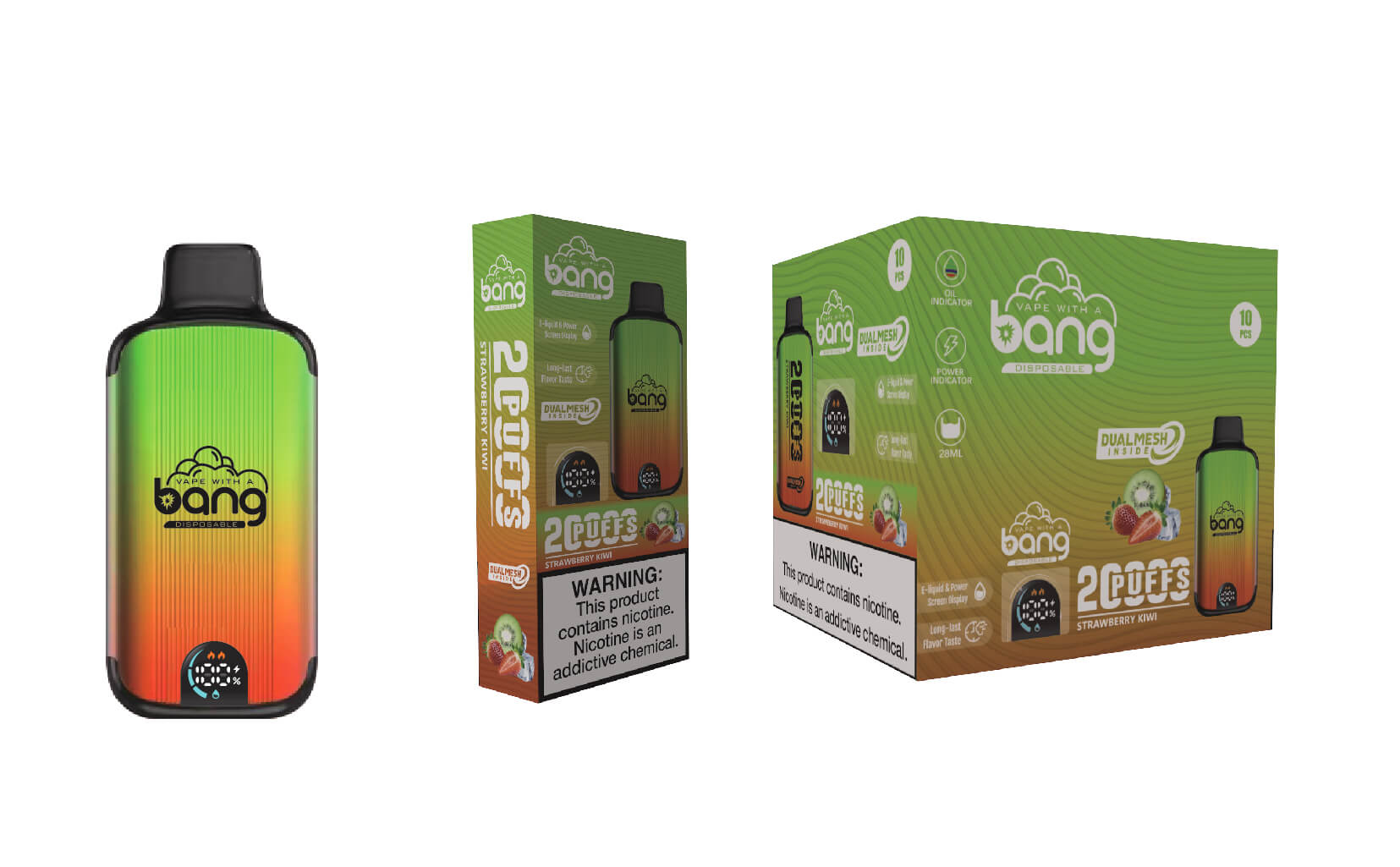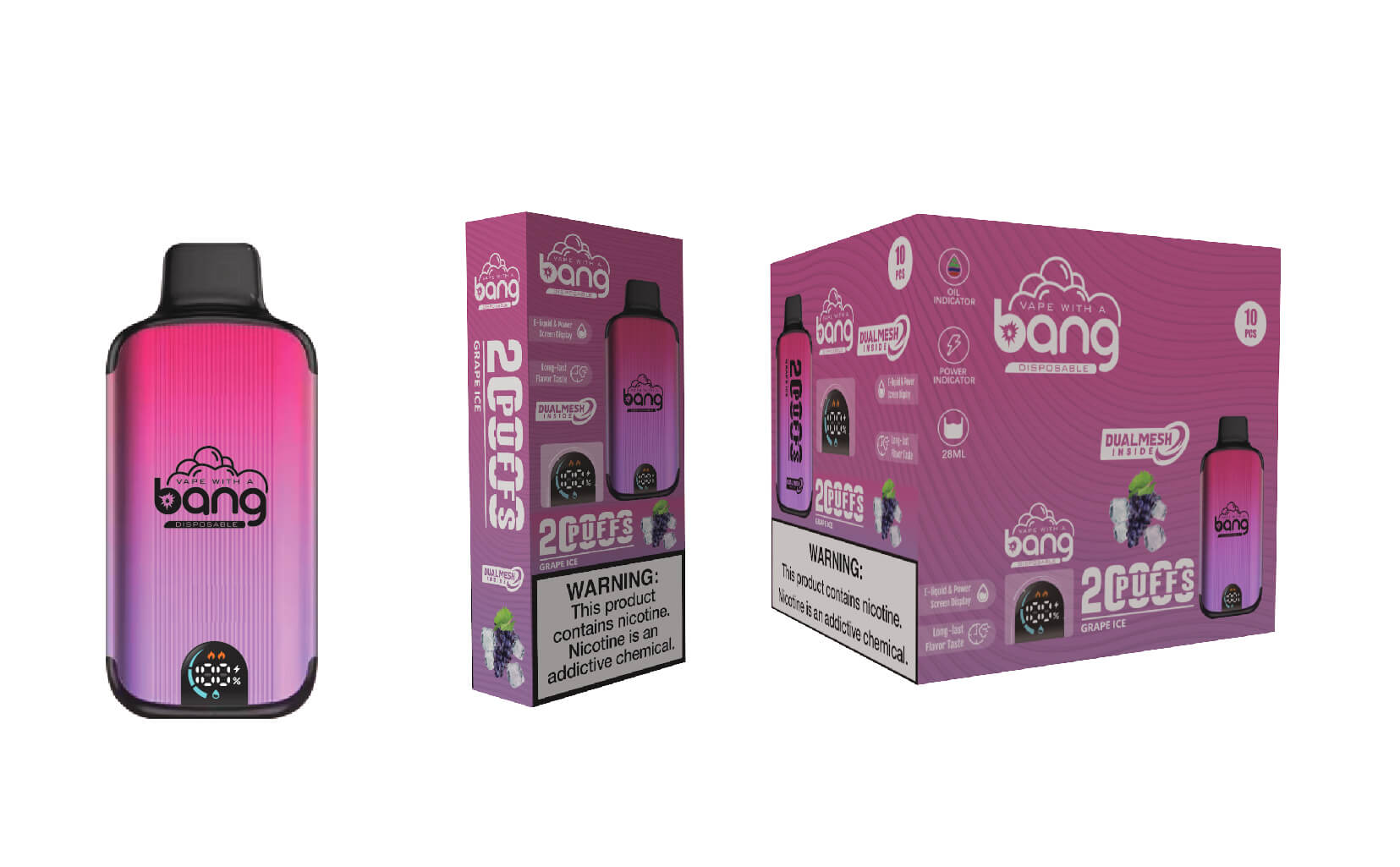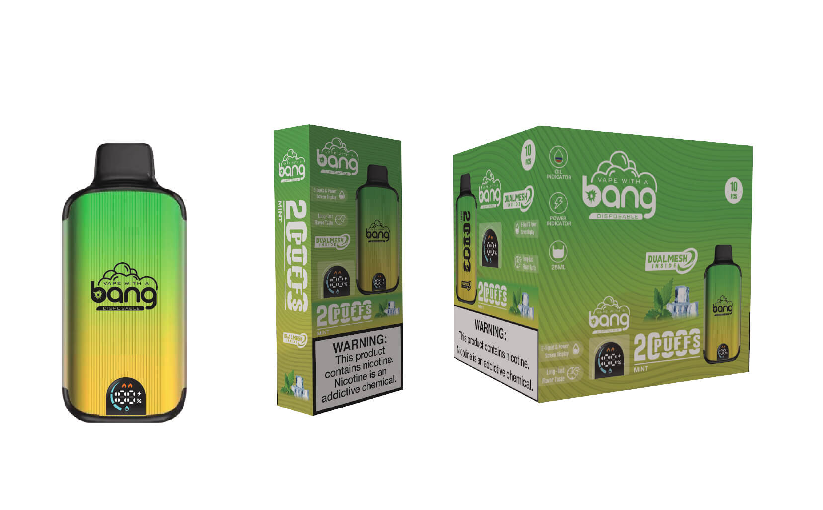 BANG 20000 Puffs Einweg-E-Zigarette mit bis zu 20.000 Zügen, 20 ml E-Liquid, 5 % Nikotinstärke, 650 mAh wiederaufladbarer Batterie, Mesh-Coil-Technologie und einstellbarem Luftstrom. Erhältlich in 16 intensiven Geschmacksrichtungen für ein langanhaltendes, hochwertiges Erlebnis.