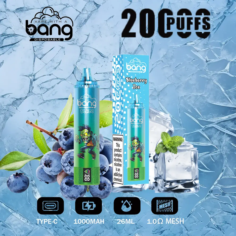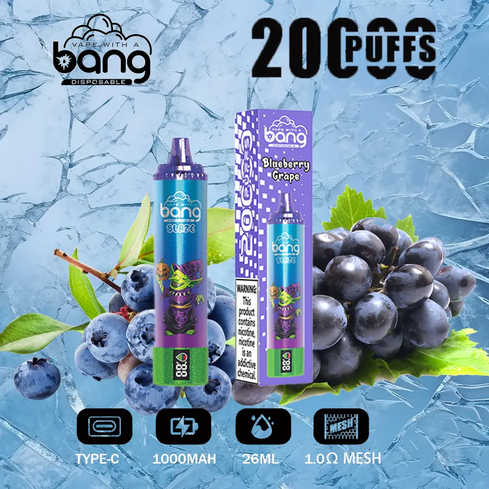 BANG BLAZE Tornado 20000 Puffs: Einweg-E-Zigarette mit 20.000 Zügen, 26 ml E-Liquid, 1000 mAh Akku mit Typ-C-Ladung, 1,0 Ω Mesh-Spule und LED-Display. Erhältlich in 0 %, 2 %, 3 %, 5 % Nikotinstärken und 12 intensiven Geschmacksrichtungen.