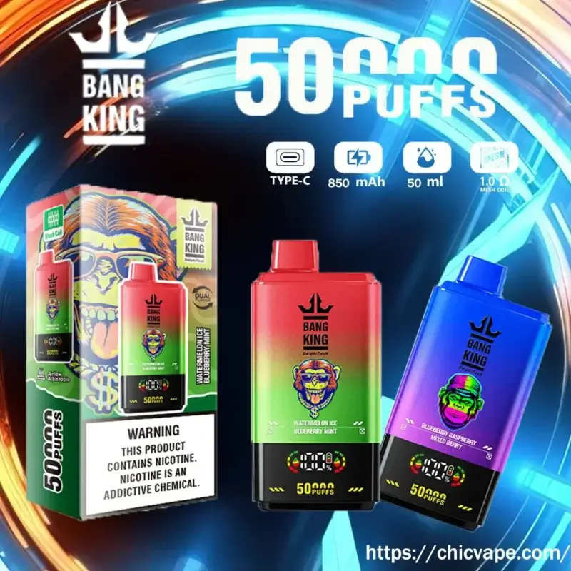 Bang King 50000 Puffs Einweg-E-Zigarette mit bis zu 50.000 Zügen, 50 ml E-Liquid, 850 mAh Akku, Typ-C-Schnellladung, 1,0 Ω Mesh-Spule, einstellbarem Luftstrom, Digitaldisplay und Doppelgeschmackssystem in 12 Varianten.