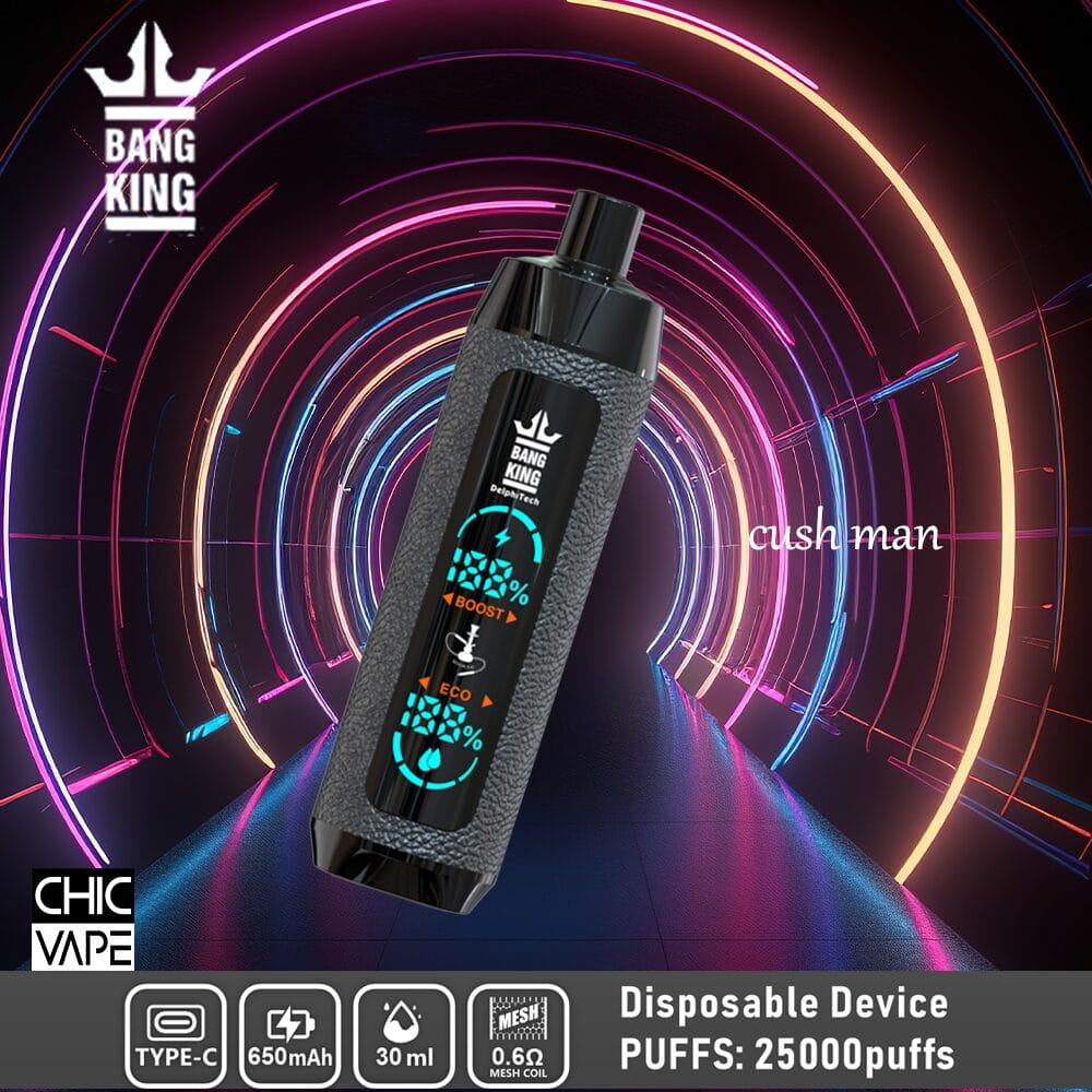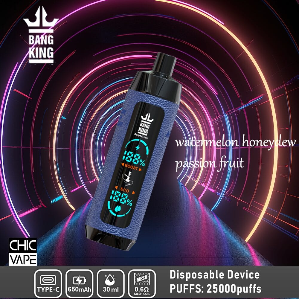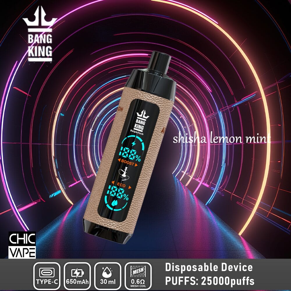 Bang King Shisha 25000 Einweg-E-Zigarette mit bis zu 25.000 Zügen, 30 ml Premium-E-Liquid, 650 mAh wiederaufladbarem Akku, 0,6-Ohm-Mesh-Spule und Typ-C-Ladeanschluss. Erhältlich in 12 intensiven Geschmacksrichtungen und Nikotinstärken von 0 % bis 5 %.