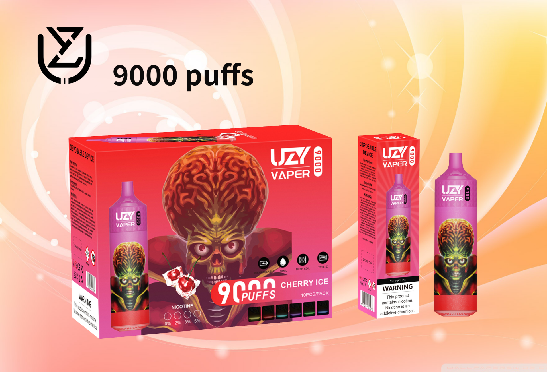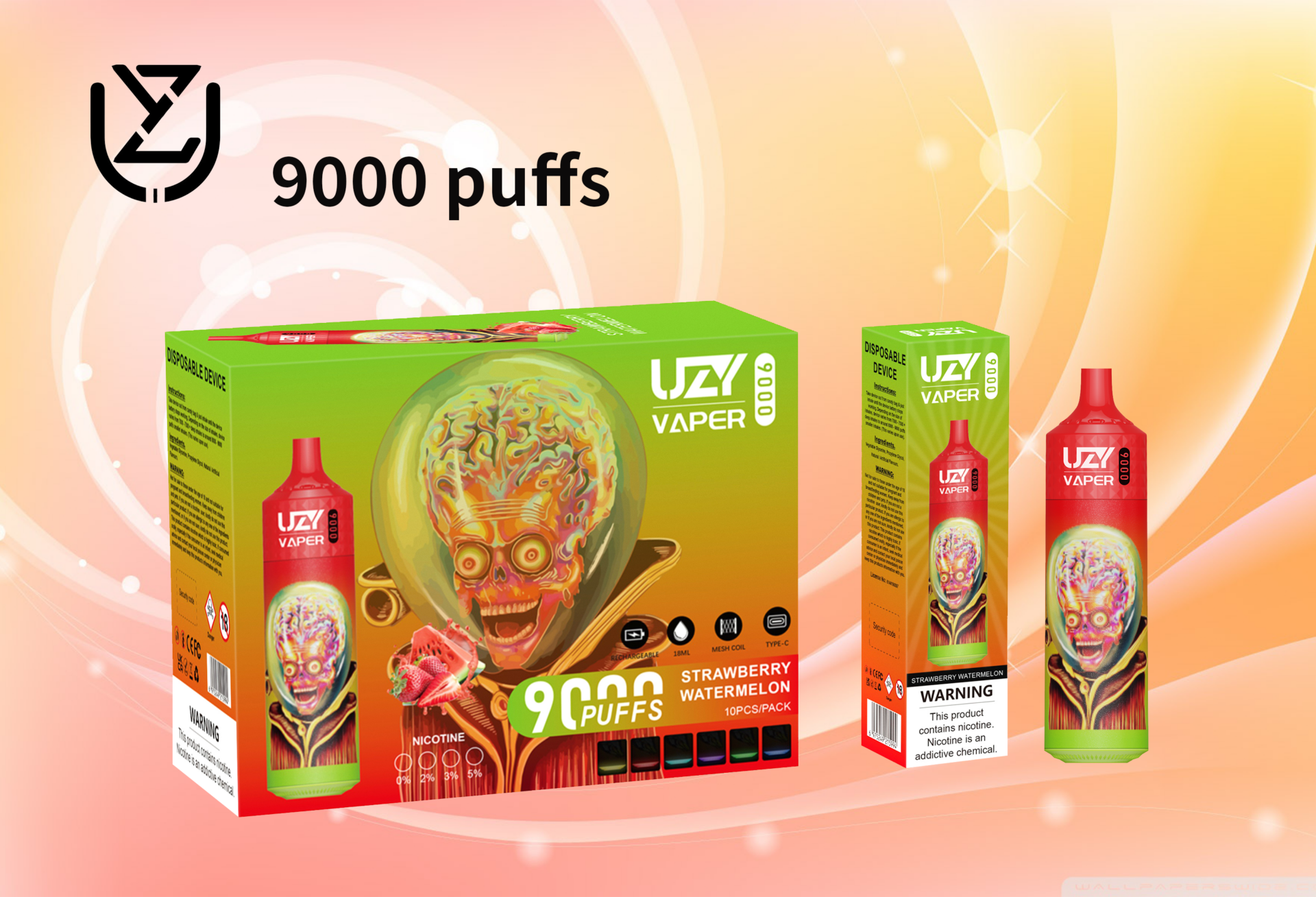 Der UZY Vaper 9000 ist in vier Nikotinstärken erhältlich – 0 %, 2 %, 3 % und 5 % – und bietet damit maximale Flexibilität. Diese Vielfalt ermöglicht es Ihnen, die Nikotinkonzentration zu wählen, die Ihren Bedürfnissen entspricht, und sorgt für ein individuell angepasstes Erlebnis.
