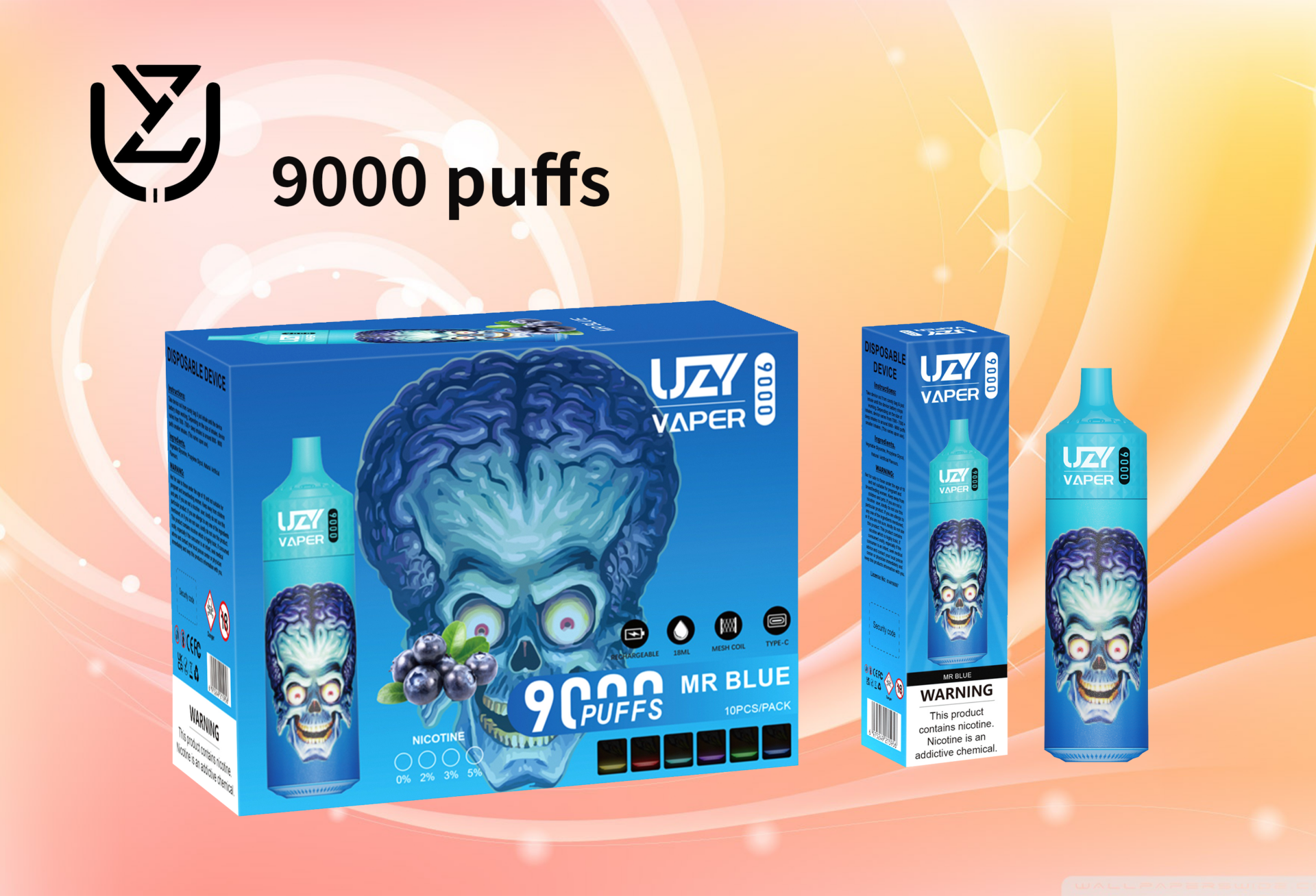 UZY Vaper 9000 Puffs: Einweg-E-Zigarette mit bis zu 9000 Zügen, 18 ml E-Liquid, 850 mAh wiederaufladbarem Akku, einstellbarem Luftstrom, 1,2-Ohm-Mesh-Coil und RGB-Licht. Erhältlich in 0 %, 2 %, 3 %, 5 % Nikotinstärken.