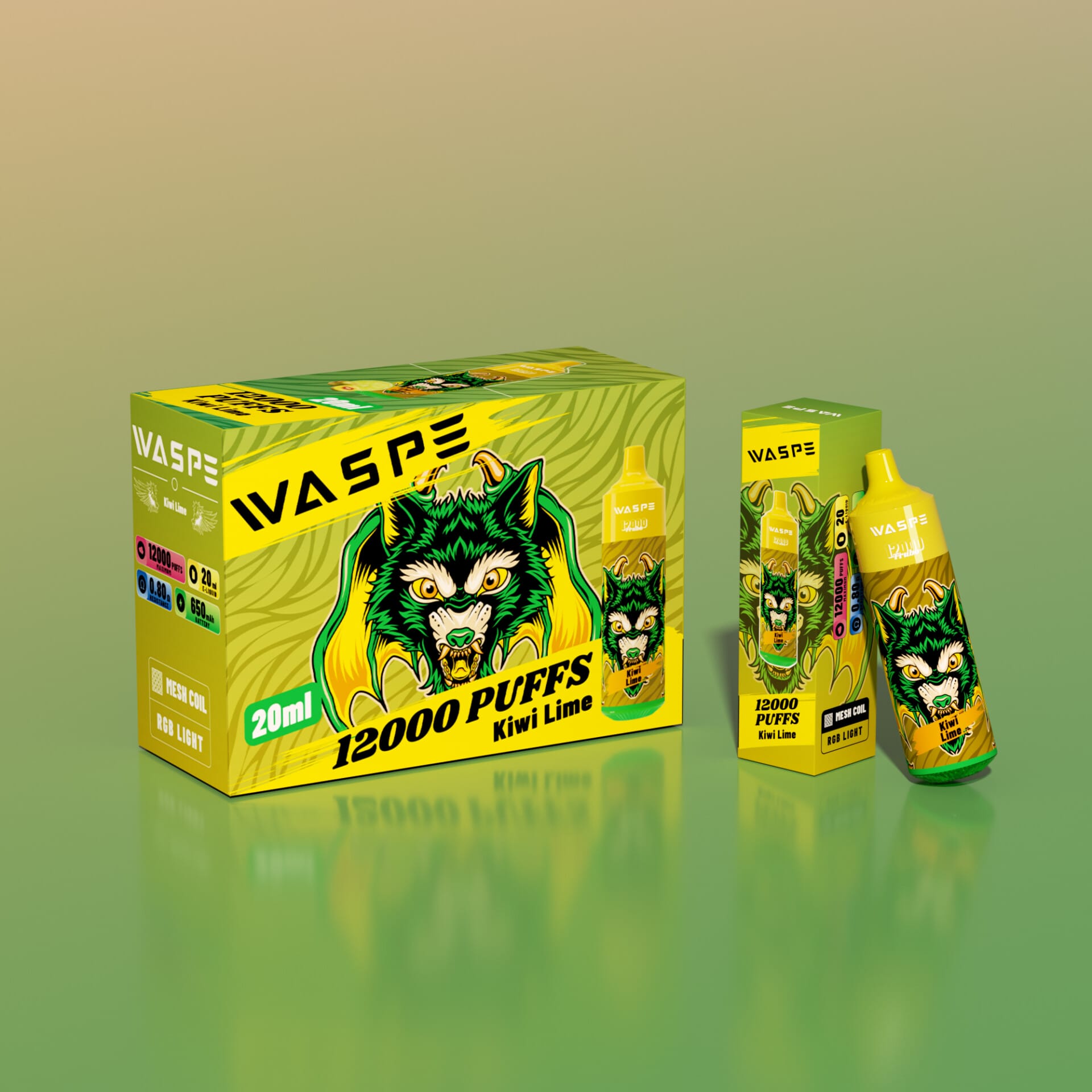 WASPE 12000 Einweg-E-Zigarette mit 20 ml E-Liquid, bis zu 12.000 Zügen, 650 mAh Akku mit Typ-C-Ladung, Mesh-Coil-Technologie und RGB-Lichtdesign. Erhältlich in verschiedenen Nikotinstärken und Geschmacksrichtungen wie Blueberry Raspberry, Mango Ice und Strawberry Kiwi.