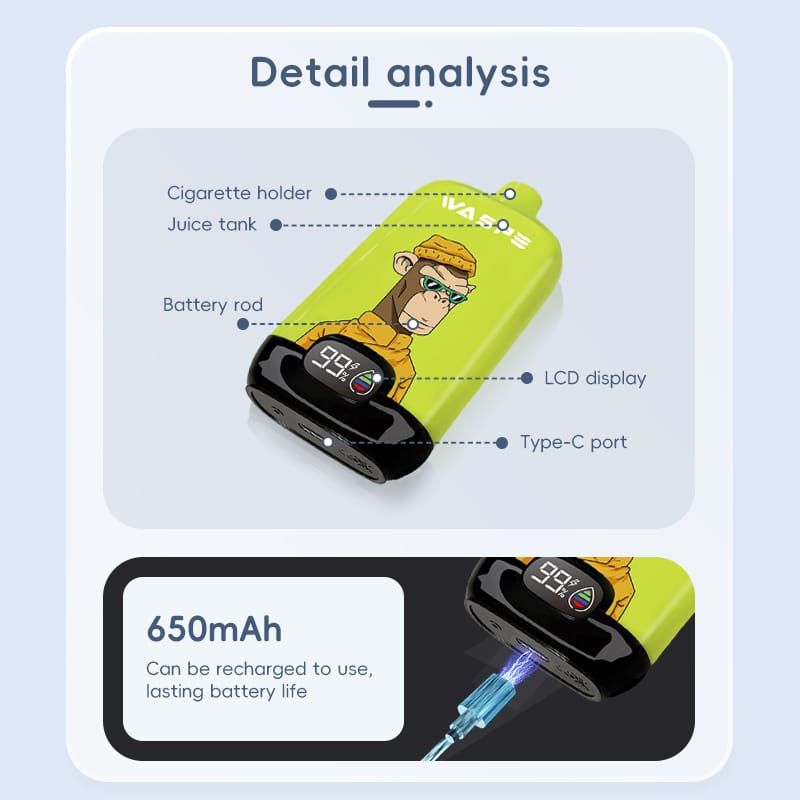 Mit einer großzügigen E-Liquid-Kapazität von 20 ml ermöglicht die WASPE Digital Box 12000 langanhaltenden Genuss ohne häufiges Nachfüllen. Diese hohe Kapazität sorgt dafür, dass Sie die volle Bandbreite der Geschmacksrichtungen über einen längeren Zeitraum hinweg erleben können, ideal für den täglichen Gebrauch.